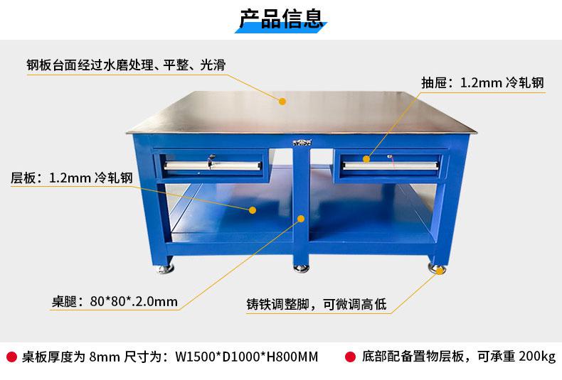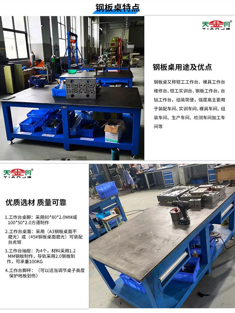钢板桌又称钳工工作台、模具工作台维修台、钳工实训台、钢板工作台、台钻工作台,组装简便,强度高主要用于装配车间、实训车间、模具车间、组装车间、生产车间、检测车间加工车 间等